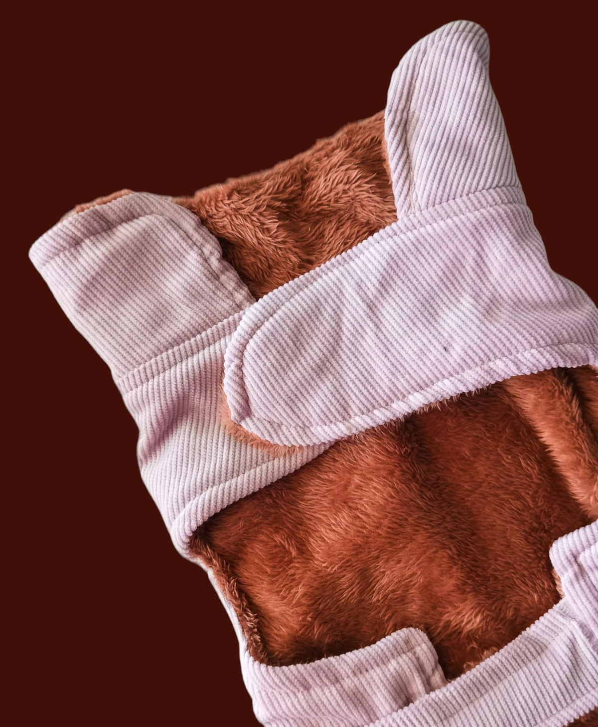 Mantén a tu mascota cálida y con estilo con nuestros sacos con interior en corderito. Este chaleco es exterior de paño/corderoy con interior corderito color camel. Perfecto para brindar comodidad y un toque de elegancia a los días muy frescos.