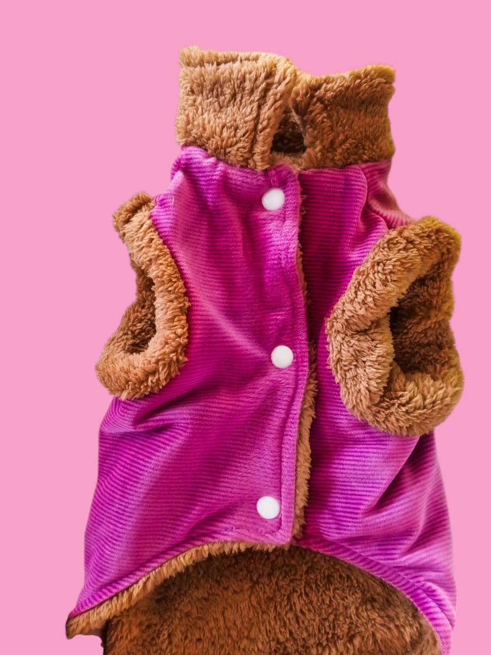 Mantén a tu mascota cálida y con estilo con nuestro chaleco de corderito. Este chaleco es exterior de gabardina con interior corderito color camel. Perfecto para brindar comodidad y un toque de elegancia a los días muy frescos.